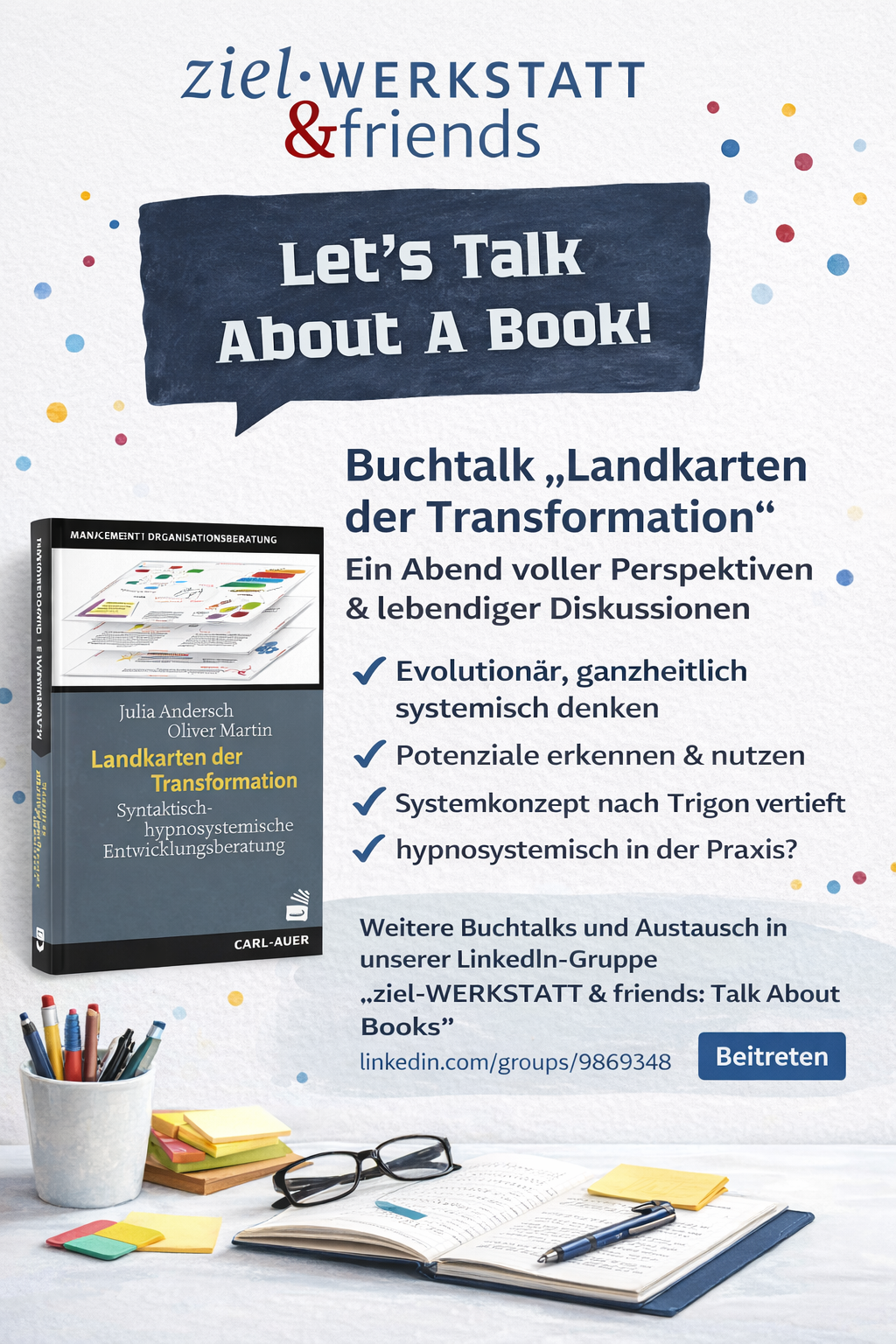 Im Mittelpunkt steht der Austausch über das Buch „Landkarten der Transformation – Syntaktisch-hypnosystemische Entwicklungsberatung“ von Julia Andersch & Oliver Martin (Carl-Auer Verlag).